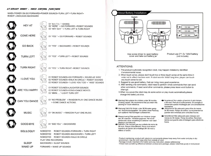 Voice Command Recognition: Say hello to hands-free fun! The AT001 Interactive Toy Robot responds to 10 simple voice commands, allowing you to interact with it in a whole new way.